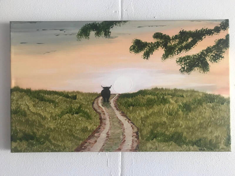 'Mijn inspiratie haal ik veelal van foto’s die ik voorbij zie komen. Het langwerpige schilderij met alleen zee en lucht heb ik gemaakt zonder afbeelding. Ik schilder met acryl verf op doek maar ook wel op hout. Soms maak ik zelf een lijst of ik haal er een bij de kringloop om het schilderij echt af te maken', aldus Hendrik die momenteel ook vrijwilligerswerk doet bij de Wolfskuil in Ommen.